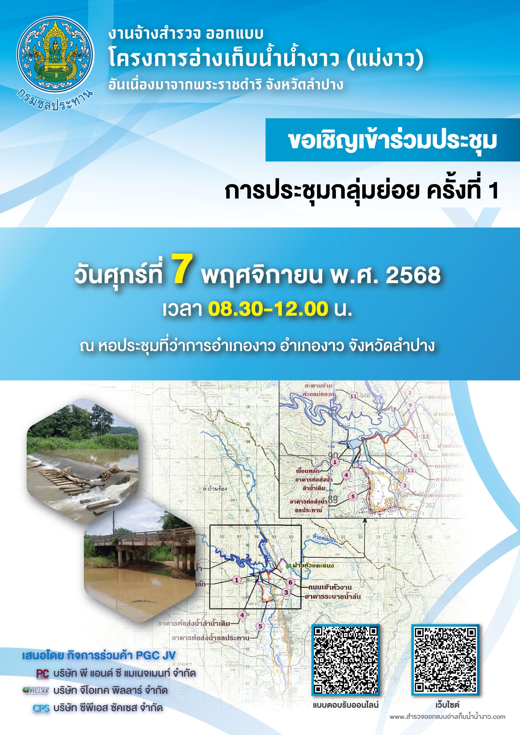 กรมชลประทานร่วมกับกิจการร่วมค้า PGC JV ขอเชิญเข้าร่วมการประชุมกลุ่มย่อย ครั้งที่ 1 งานจ้างสำรวจ ออกแบบ โครงการอ่างเก็บน้ำน้ำงาว (แม่งาว) อันเนื่องมาจากพระราชดำริ จังหวัดลำปาง